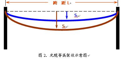 當(dāng)光纜的氣象條件確定后,可以按照客戶要求的跨距和芯數(shù)進(jìn)行設(shè)計(jì)了.ADSS光纜有等高和不等高架設(shè)兩種方式,圖2為等高架設(shè)時(shí)光纜的懸掛情況.